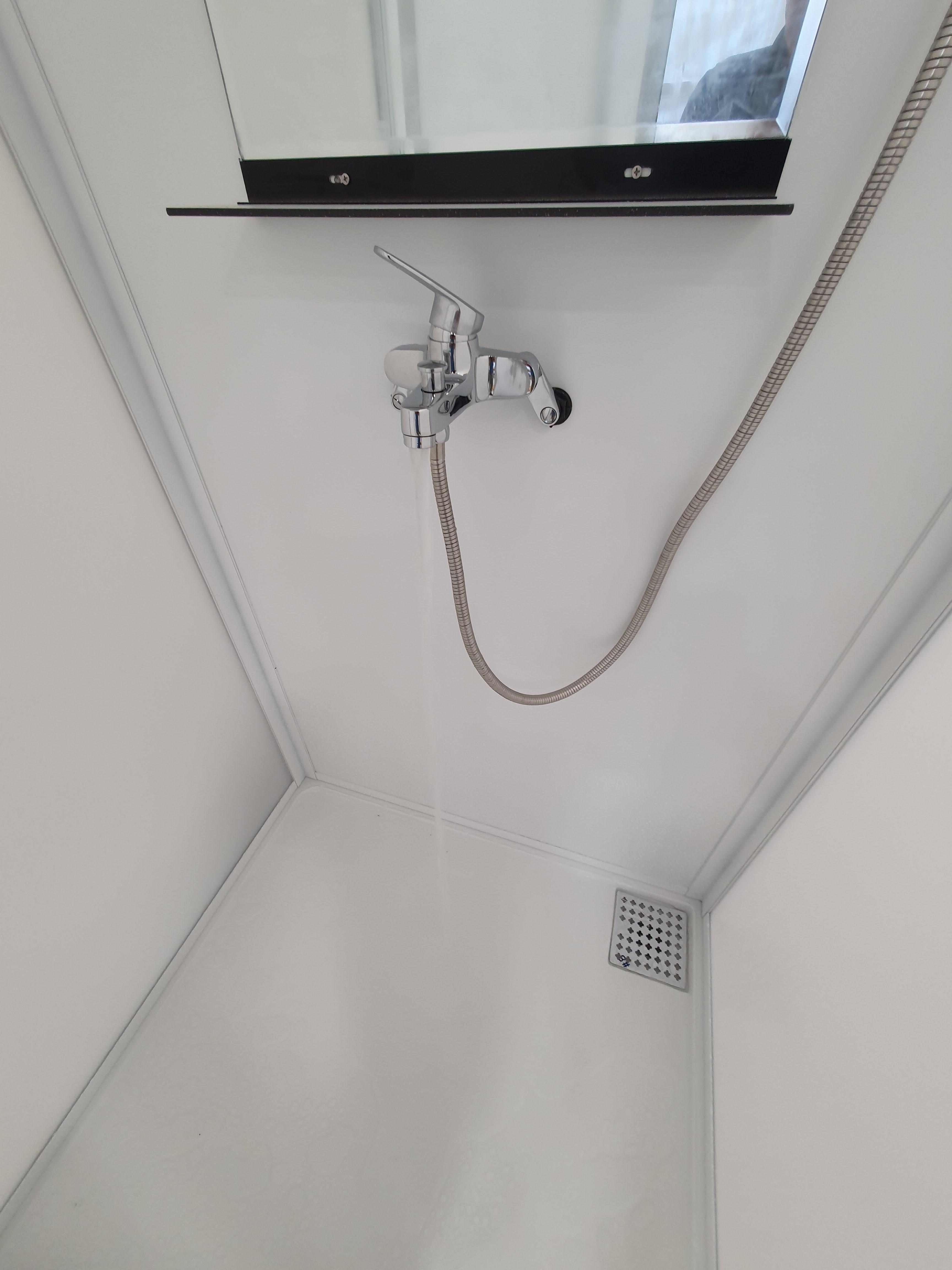 10여 분이 지나면 물이 데워지기에 간이 샤워부스 샤워기 수전을 온수 쪽으로 틀어서 온수가 잘 나오는지 확인을 해 줍니다.