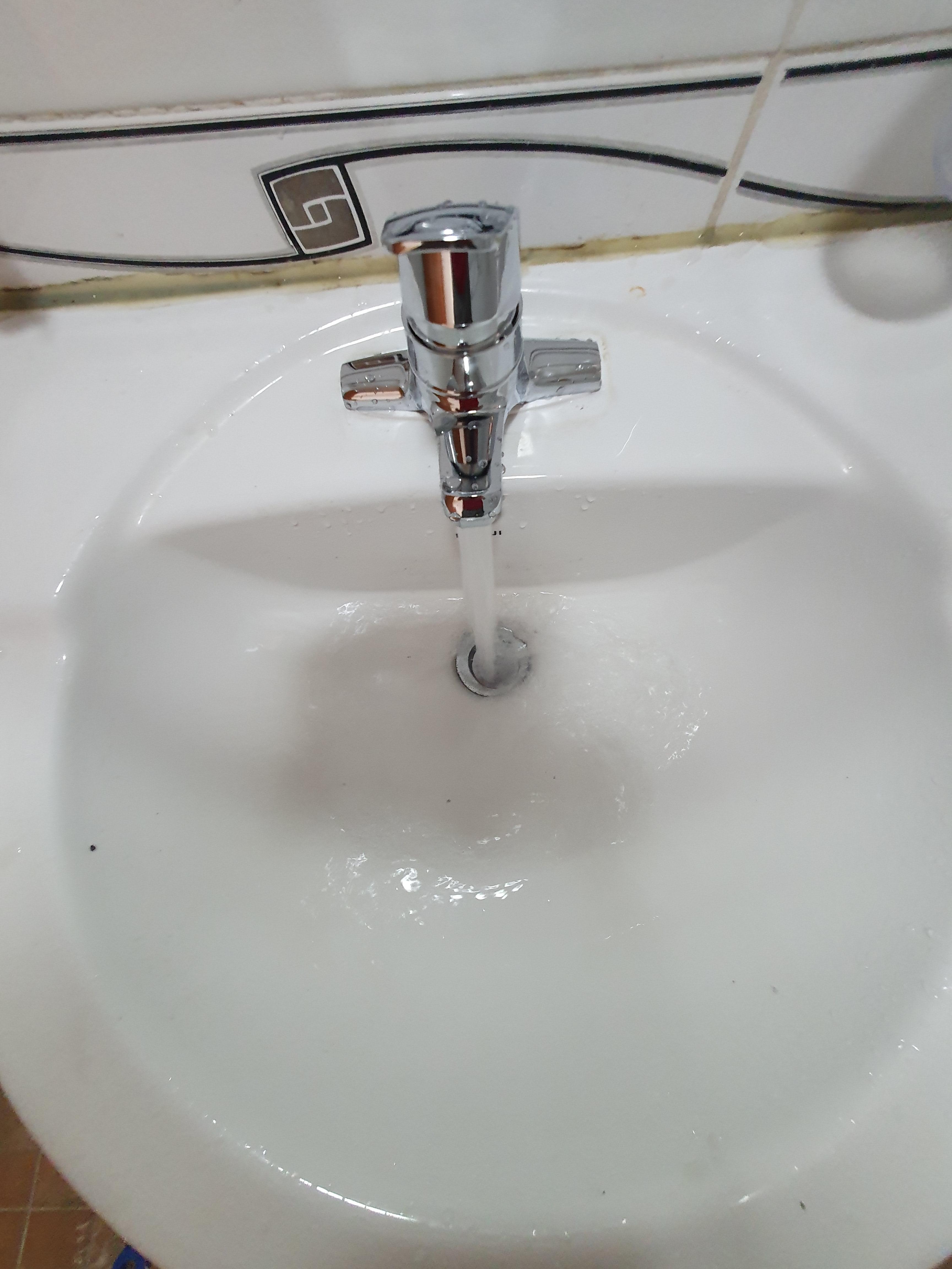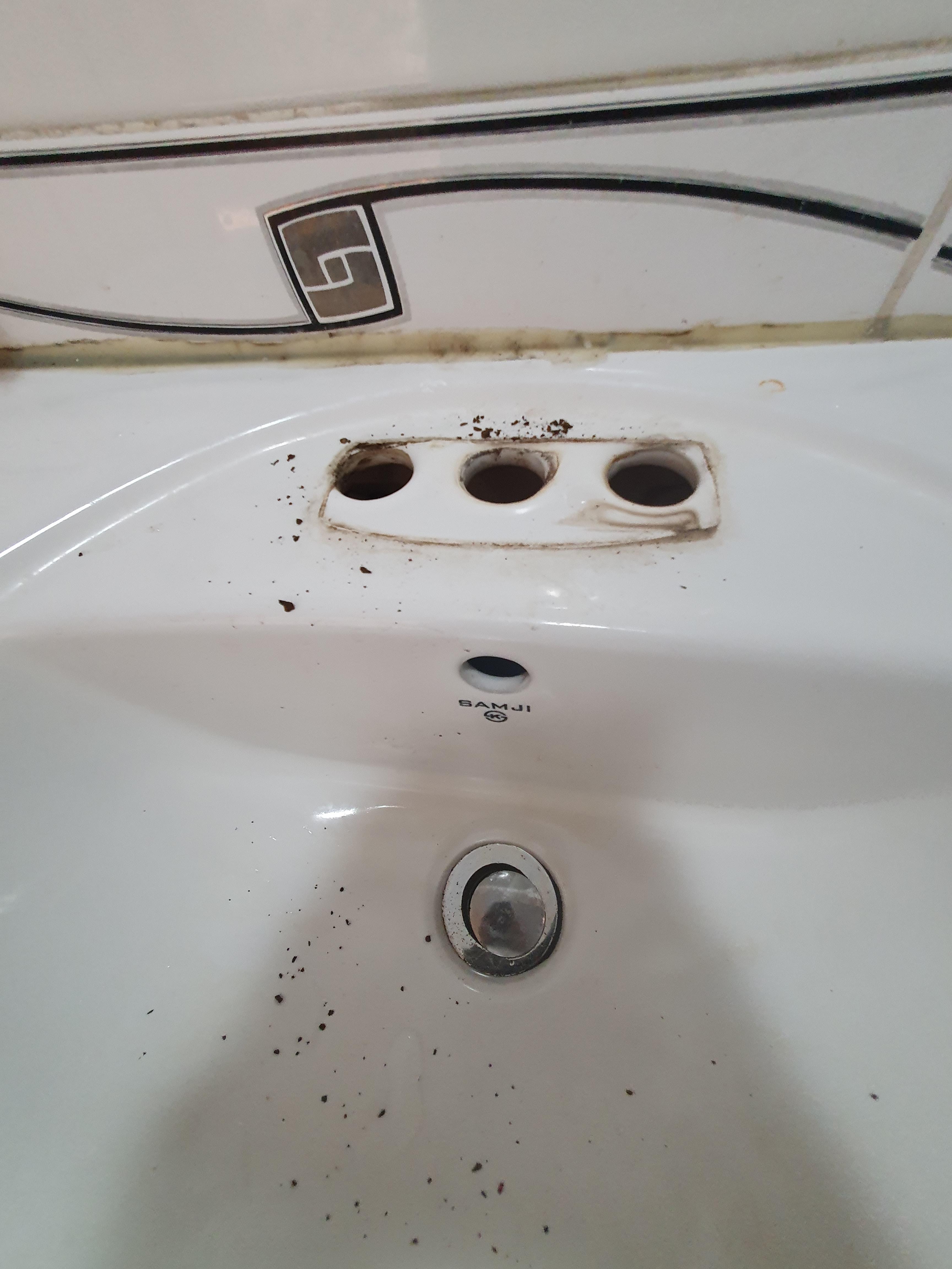현장에 와서 세면대 수전을 틀어보니 검은색 이 물질이 많이 나오고 물도 쫄쫄쫄 나옵니다.