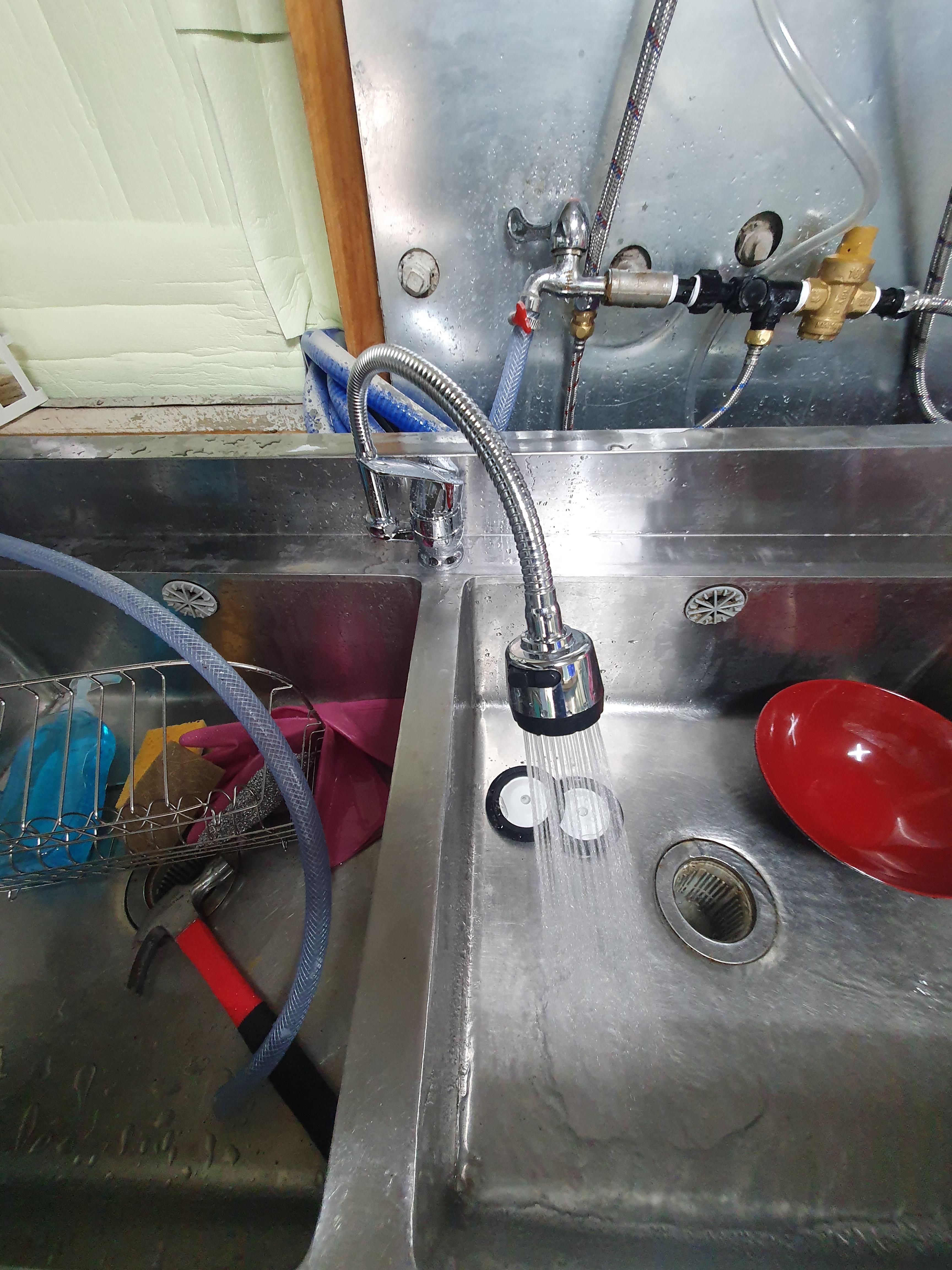 싱크대 수전을 틀어서 데워진 물이 잘 나오는지 확인을 해 줍니다.