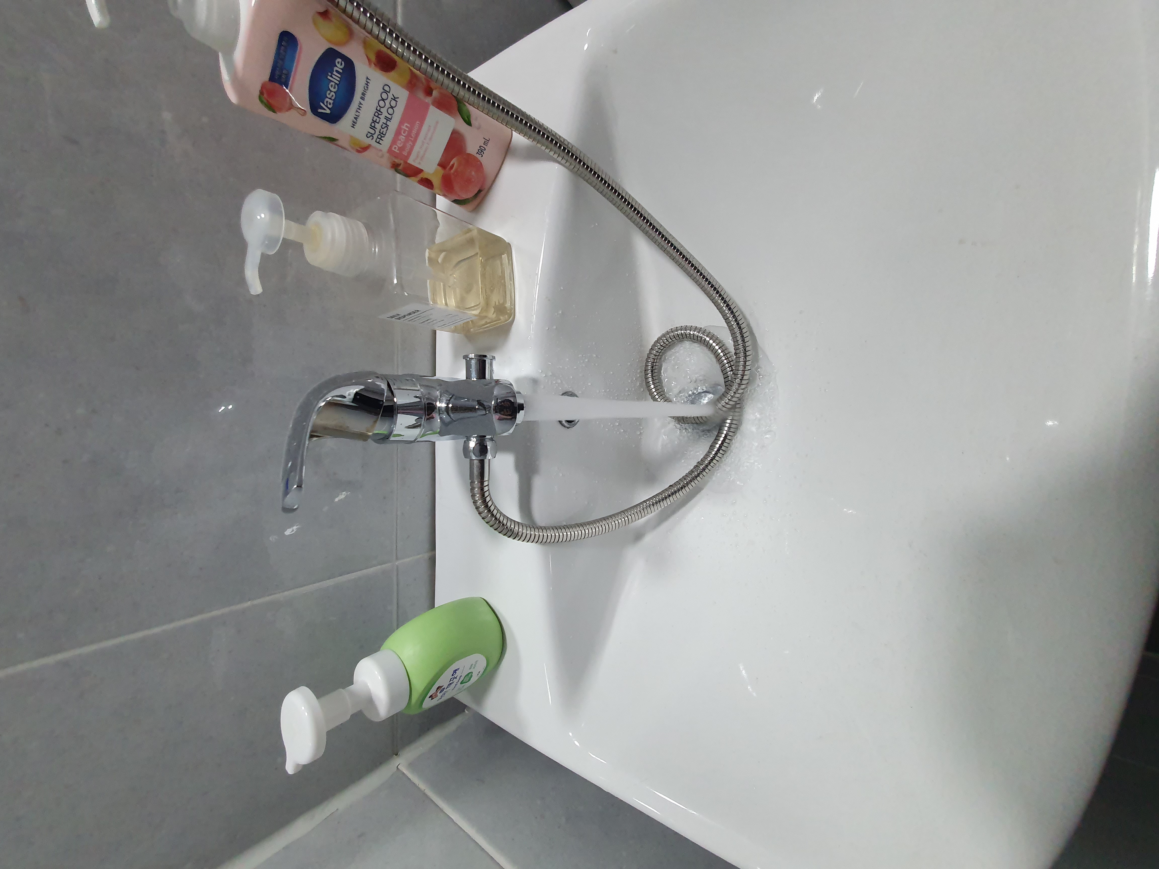 시간이 조금 지나고 물이 데워졌다면 세면기 샤워 겸용 수전 밸브를 온수 쪽으로 열어서 데워진 물이 나오는지 확인을 합니다.