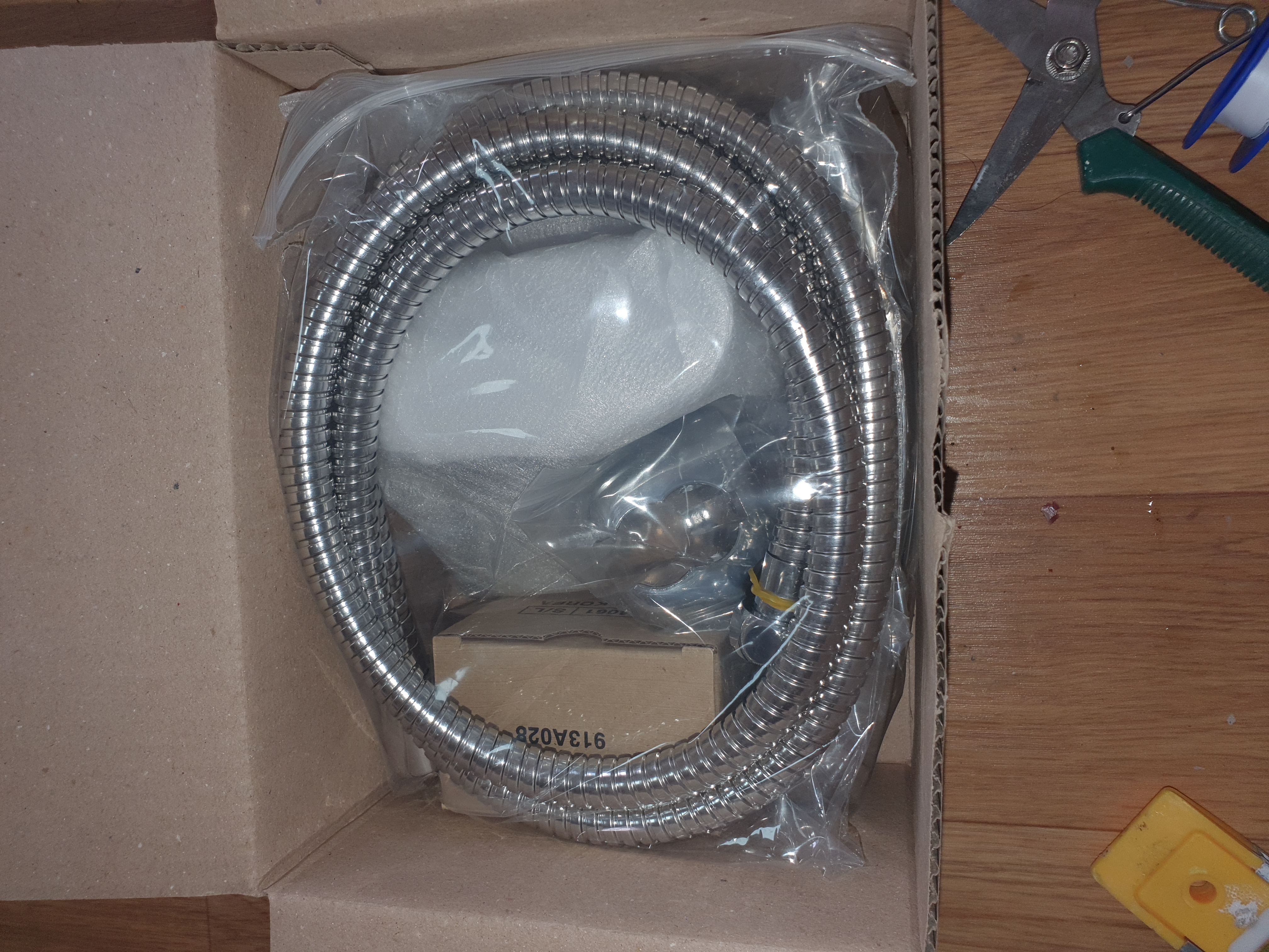구성품으로는 샤워기 수전 몸체와 s자 니플 2개 왕 2개 고무패킹 2개 샤워기 줄